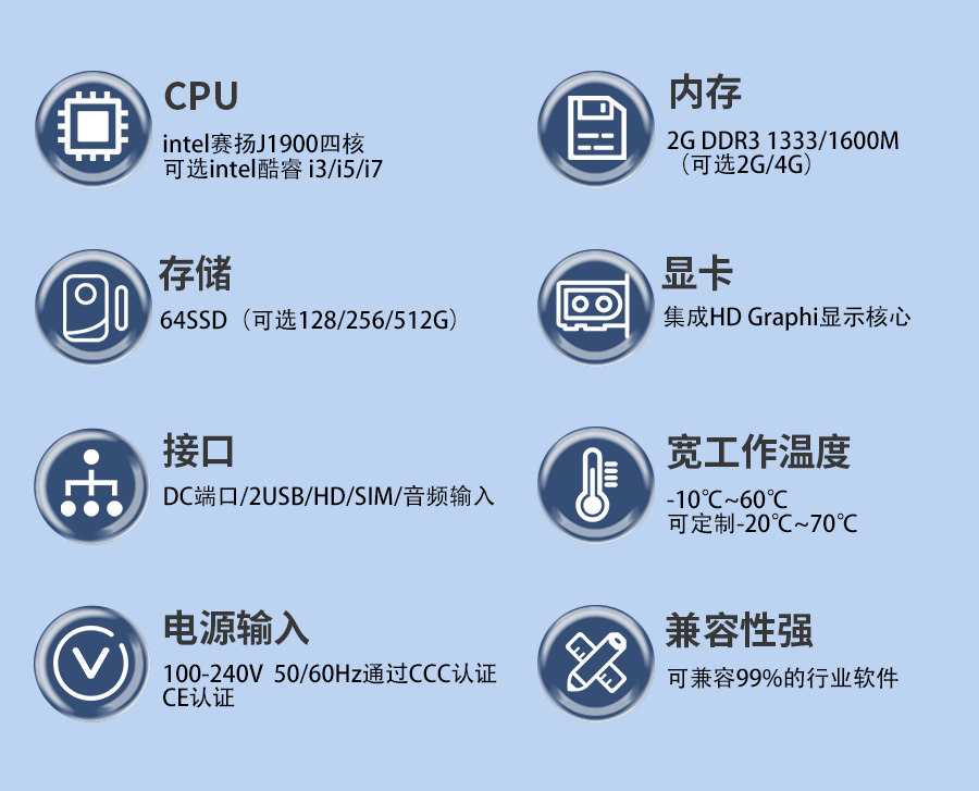 五代工業(yè)一體機(jī)工作溫度達(dá)-10℃~60℃,可定制-20℃~70℃;儲存溫度達(dá)-20℃~70℃。搭配Intel賽揚(yáng)J1900四核處理器(可選Intel賽揚(yáng)J4215、酷睿i3/i5/i7)2G DDR3/64G SSD,集成HD Graphi顯示核心,觸摸屏可選擇多種觸摸方式,兼容99%的行業(yè)軟件,適配各種電力管理系統(tǒng),網(wǎng)絡(luò)互聯(lián),形成系統(tǒng),解決傳統(tǒng)電力機(jī)柜獨(dú)立運(yùn)行問題。