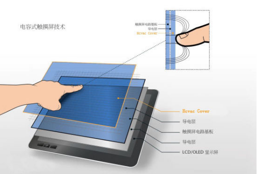 2)電容屏:全稱為電容式觸摸屏,俗稱“硬屏”,是一塊四層復(fù)合玻璃屏,第一層是ITO,用以保證工作環(huán)境,第二層是玻璃,第三層也為ITO涂層,做工作面使用;第四層則是矽土玻璃保護層。